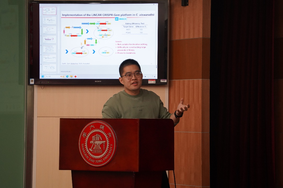 特邀报告环节,中国科学院微生物研究所王为善研究员作了题为“‘代谢-调控’协同重塑次级代谢药物细胞工厂”的学术报告,华东理工大学生物反应器工程国家重点实验室谭高翼教授分享了“CRISPR/Cas使能技术驱动的血红素及卟啉化合物的生物制造”的最新研究成果,在场的教师与特邀专家展开了高水平的学术对话,同学们也积极参与互动研讨。